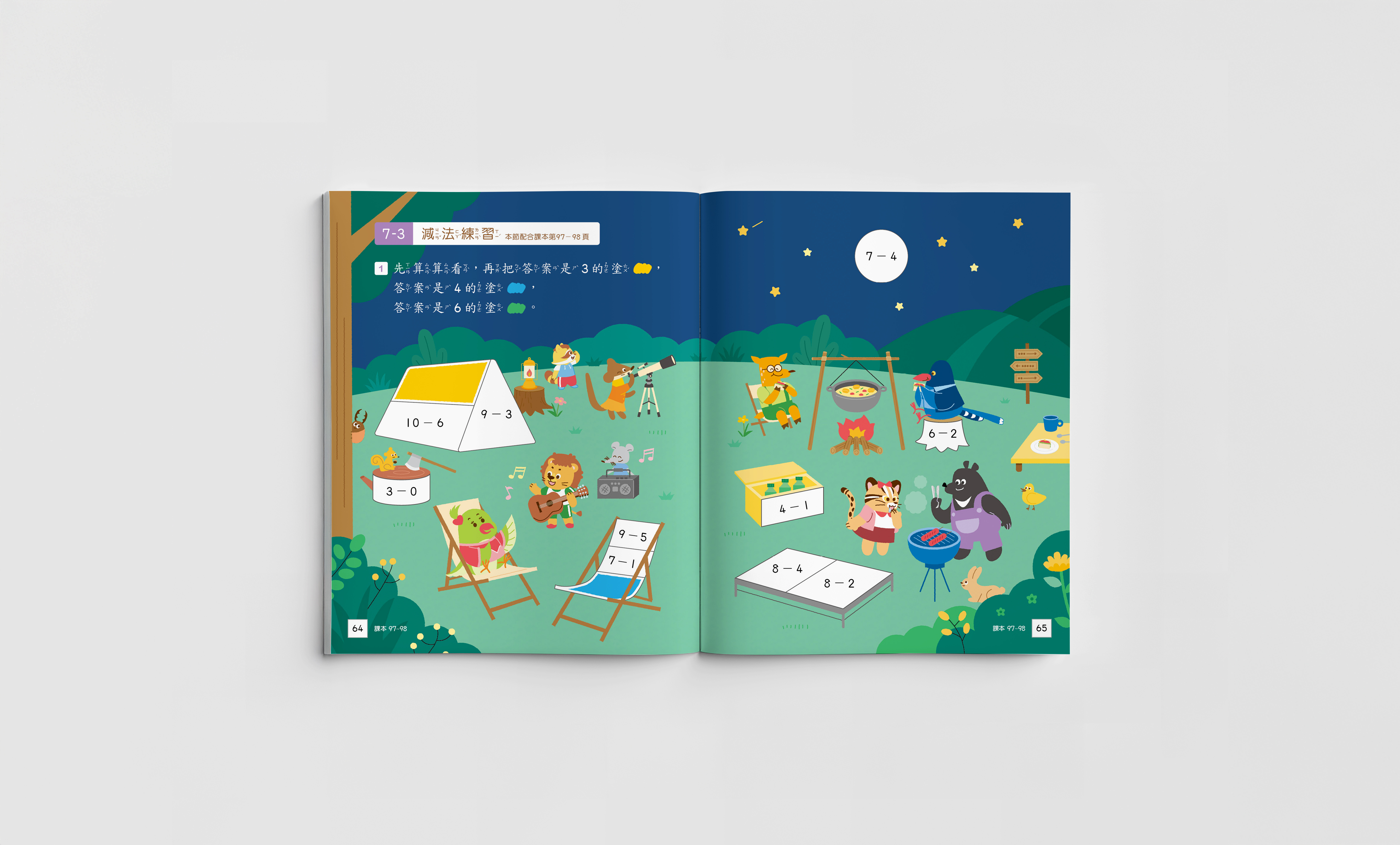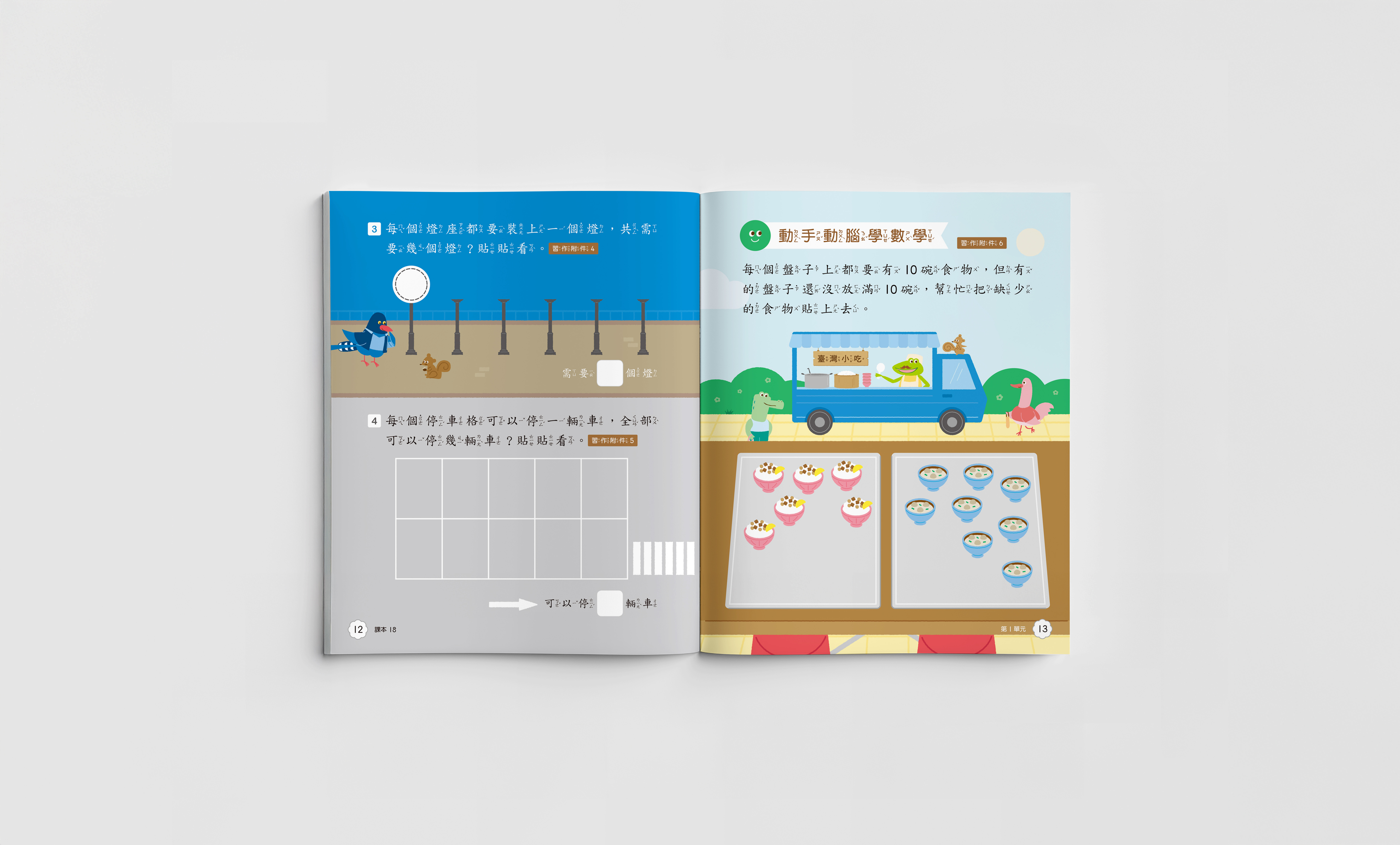 在傳統數學題型中,加入貼紙、塗色等元素,將既有的數學計算融入互動及參與感。 - 角色設計