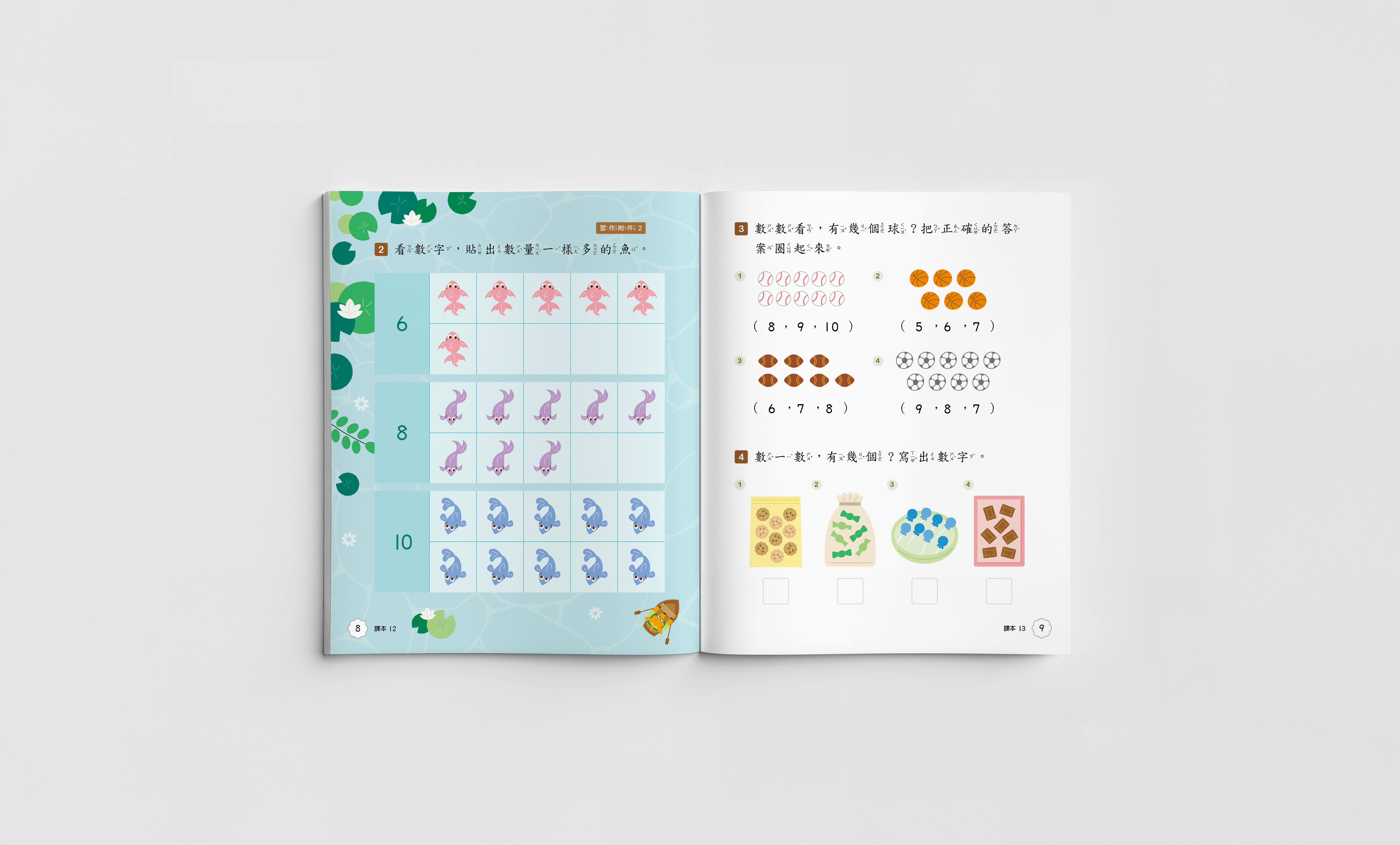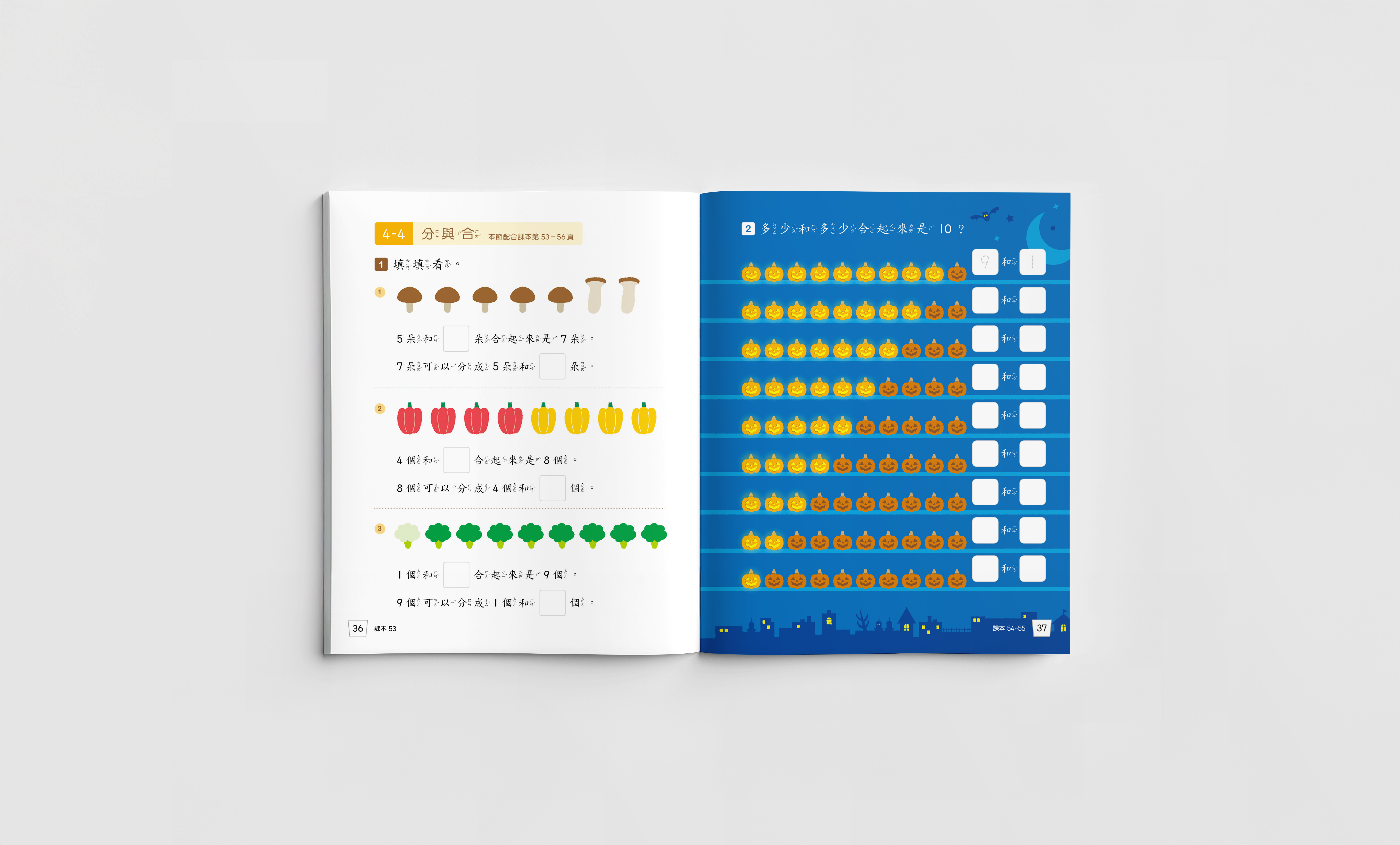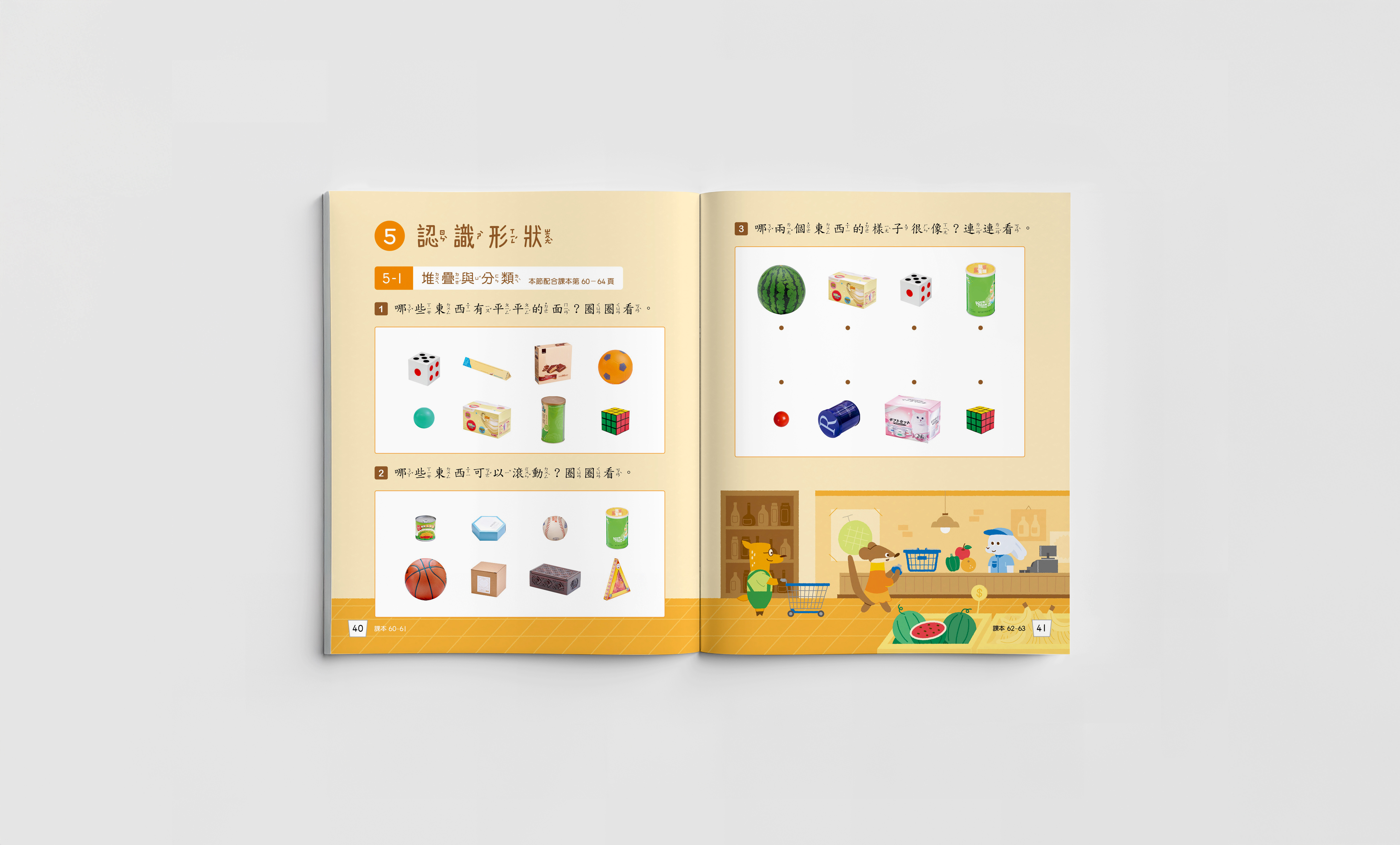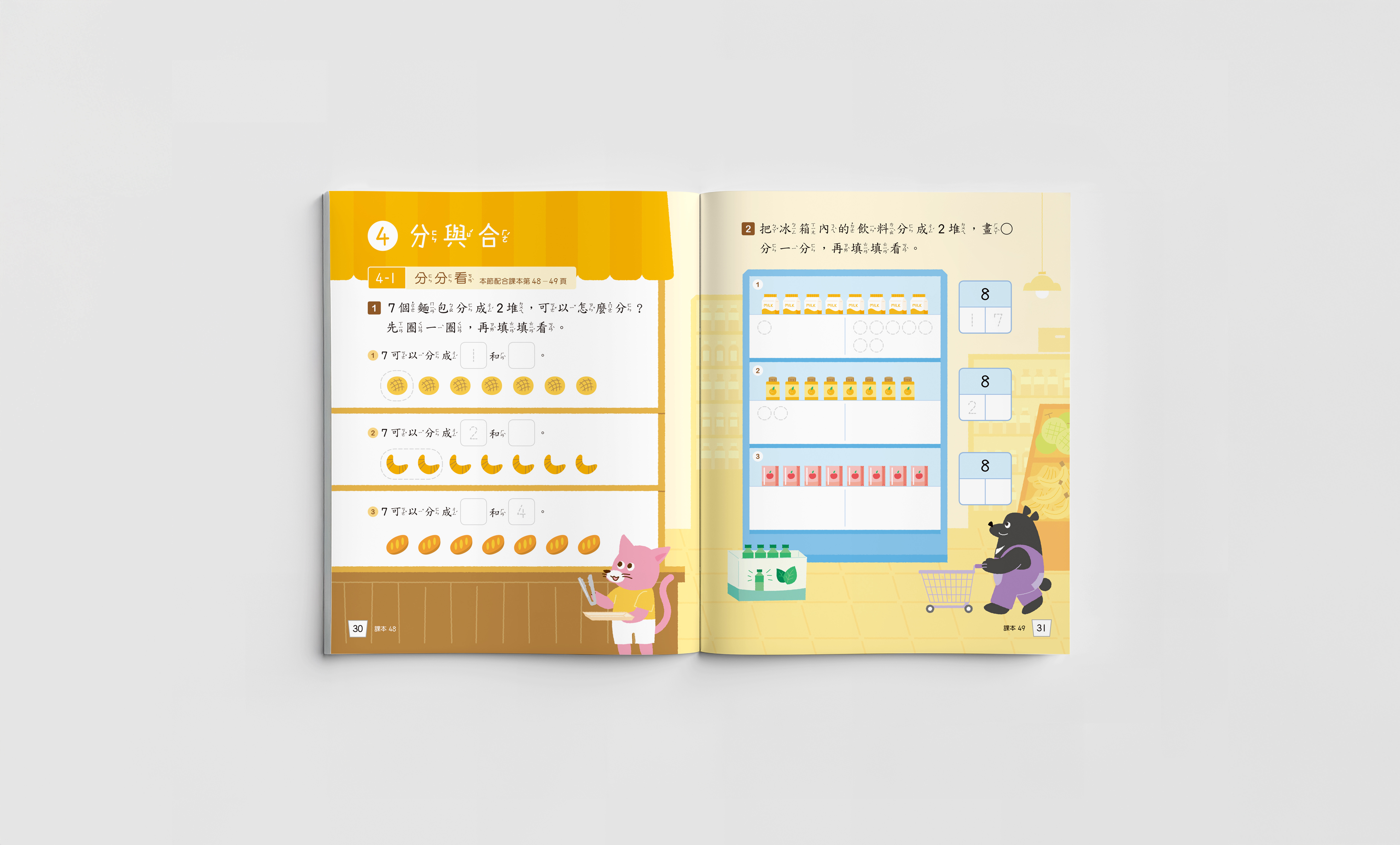 每三個章節設計一個主題情境,將公園、超市、山上等場景融入課程內容,讓學習數學的過程能與日常生活有所連結,同時在情境中導入本土的元素,在各個頁面隱藏小彩蛋,增加學習過程的趣味性。 - 時節與主題的色彩對應