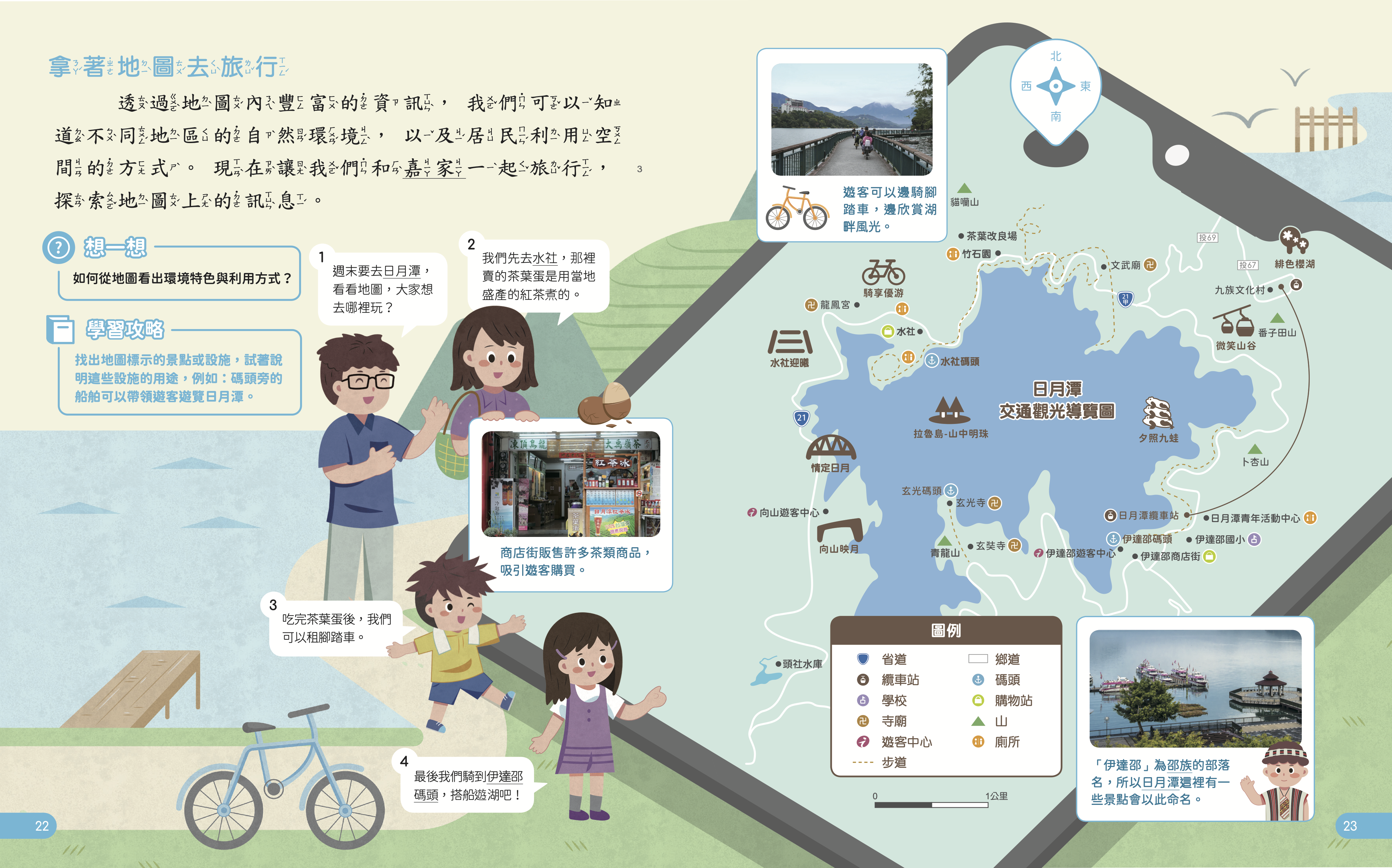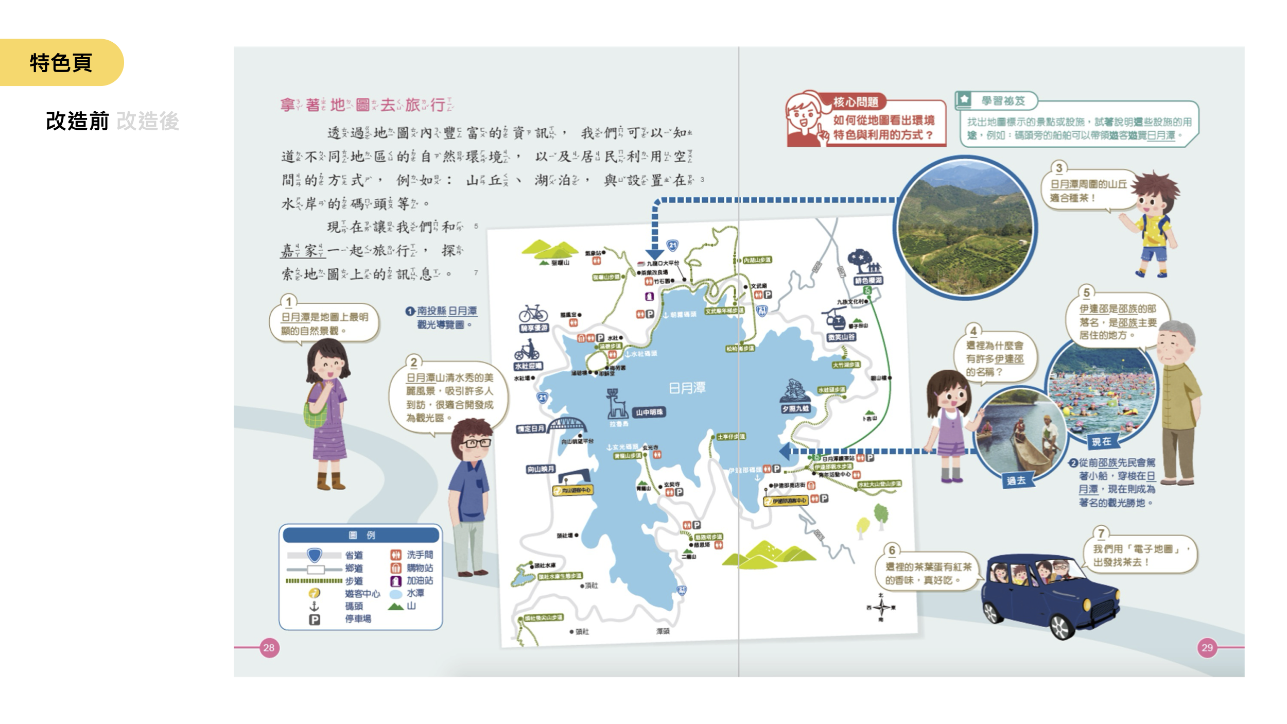 透過圖像化的情境與生活化的語言,搭配角色對話與實際案例,引導學生從觀察中思考自然環境、多元文化與人類活動的關係。 - 亮點頁面設計