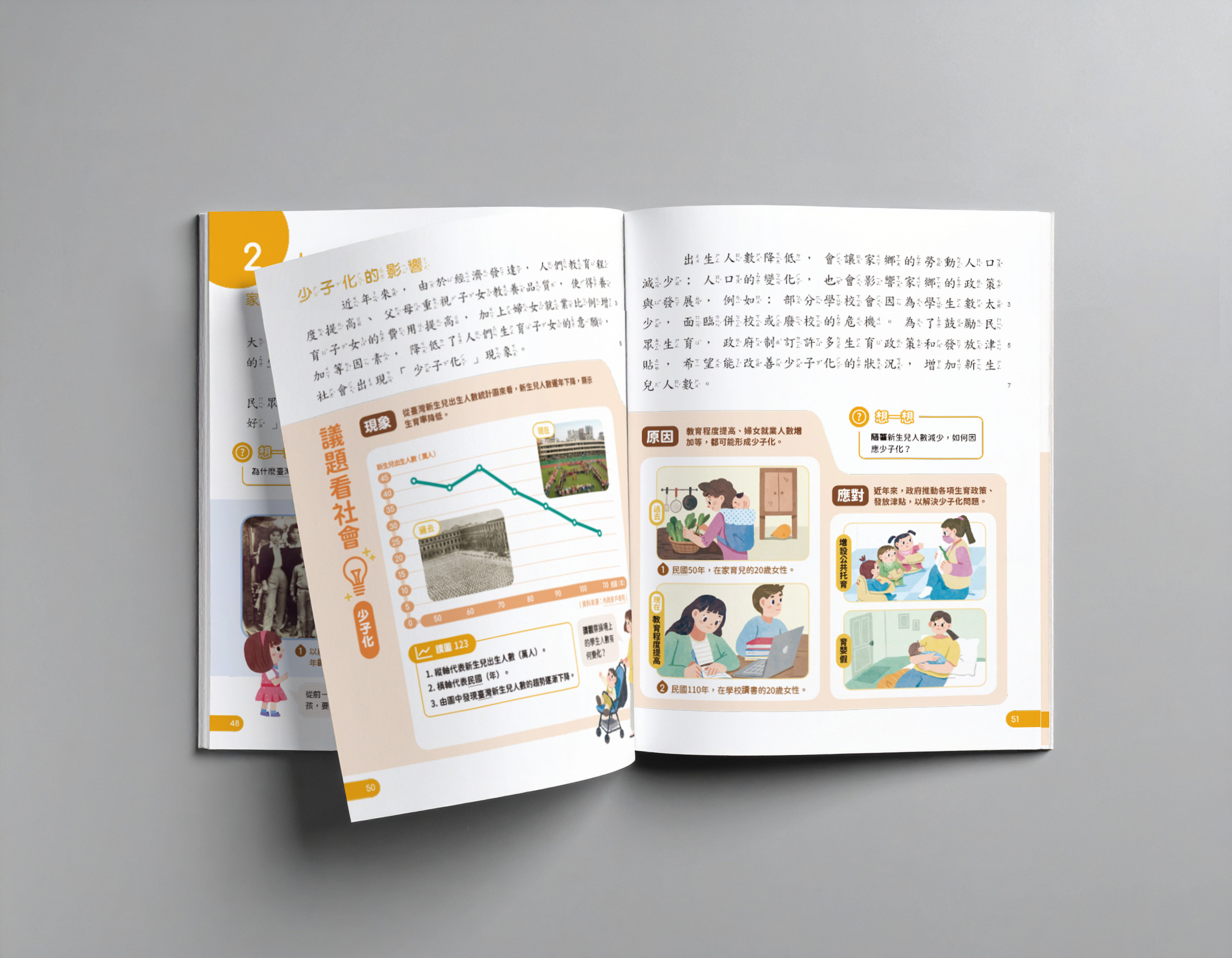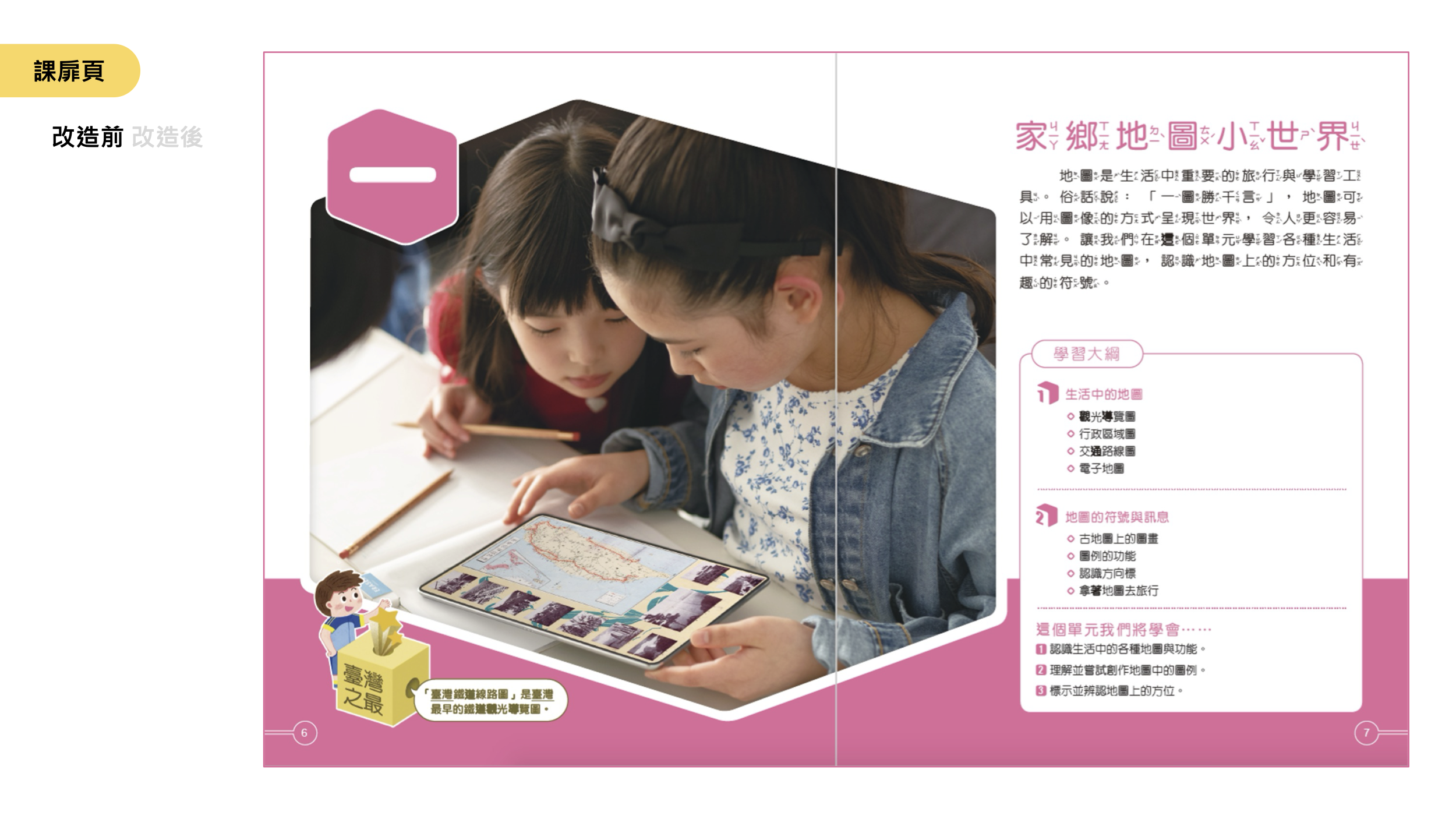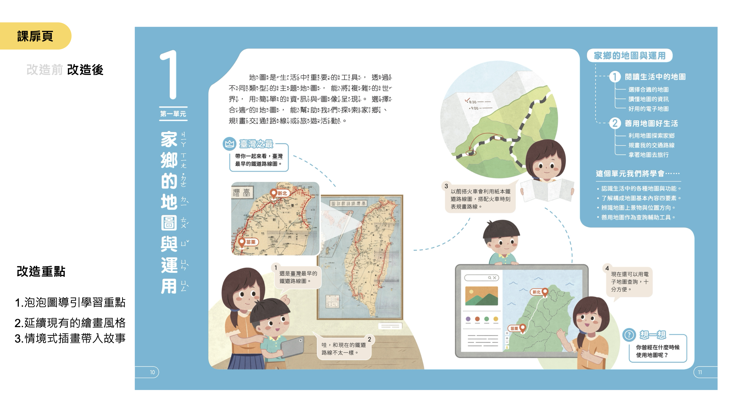 在現有課本的基礎下,期望透過版型的優化提升可讀性,同時藉由扉頁的情境式插畫及特色頁面的設計規劃,創造全新的視覺感受。