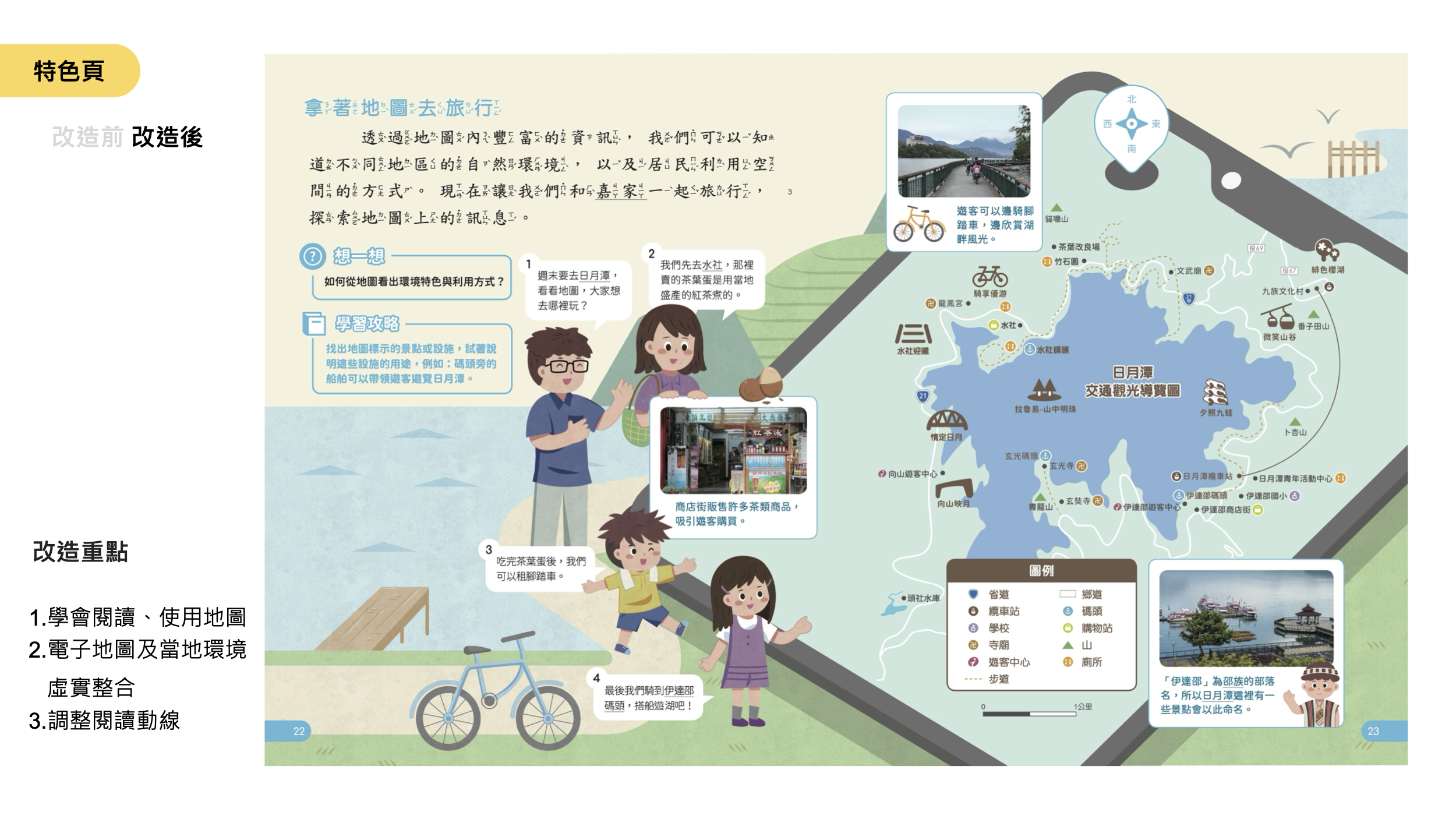 以日月潭為範例設計主題式地圖,搭配角色提問與實景圖說,讓學生從使用者的角度認識地圖資訊,引導學生在旅遊情境中學習空間位置與地圖符號,同時培養對於空間的理解與人地互動思維,真正落實「看得懂、用得上」的地圖學習。